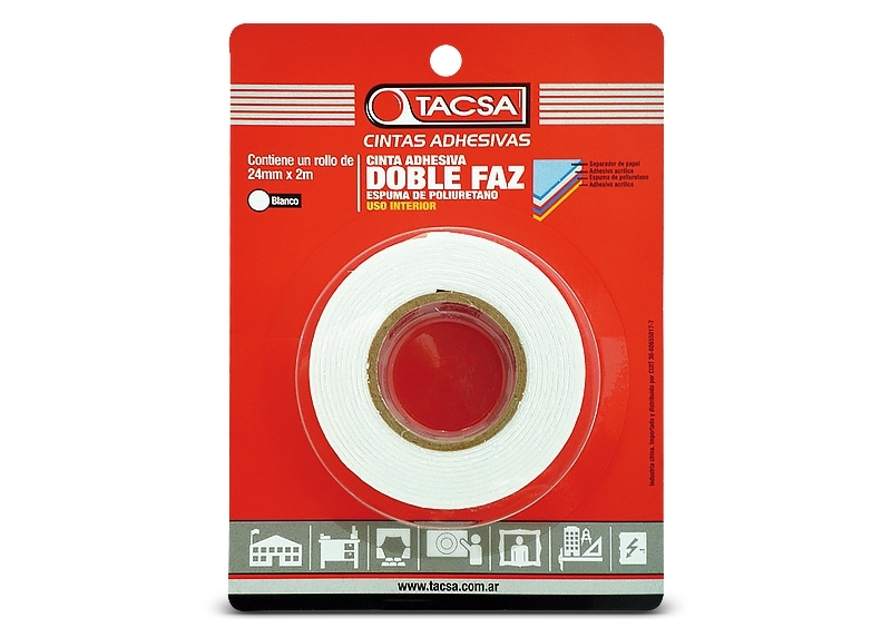 La cinta doble faz permite el montaje y sujeción de objetos sobre superficies de forma permanente. Gracias a las propiedades adhesivas de esta cinta pueden pegarse superficies diferentes como ladrillo, madera, metal, cerámicos, vidrio, paredes pintadas, terminaciones finas (mampostería).