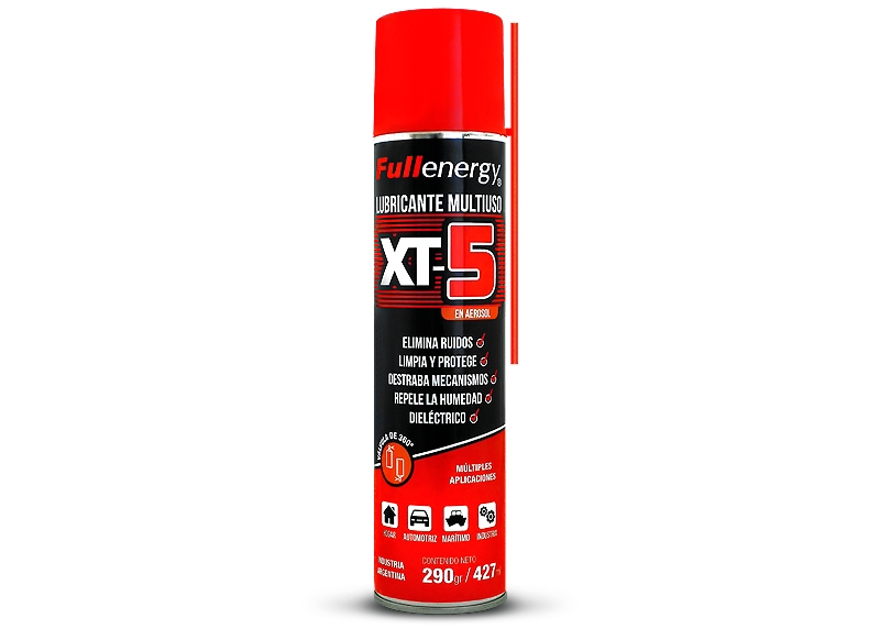 El poderoso lubricante multiuso XT-5, está específicamente formulado para limpiar y proteger cualquier pieza articulada. Elimina ruidos molestos de máquinas, bisagras, etc. Elimina la corrosión, desplaza la humedad y limpia tableros eléctricos. No es conductivo, soportando voltajes de hasta 15kV. No contiene aceites.