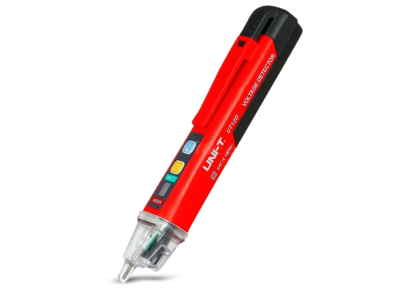 El detector de voltaje sin contacto UNI-T UT12D pueden detectar rápidamente el polo vivo en instalaciones de voltaje alterno CA. Estos prácticos dispositivos son excelentes aliados de especialistas en electricidad para verificar de forma segura y rápida el estado de los cables eléctricos. Este modelo UT12D incluye modo simple / doble de detección (Bajo y Alto Voltaje) y linterna LED incorporada.